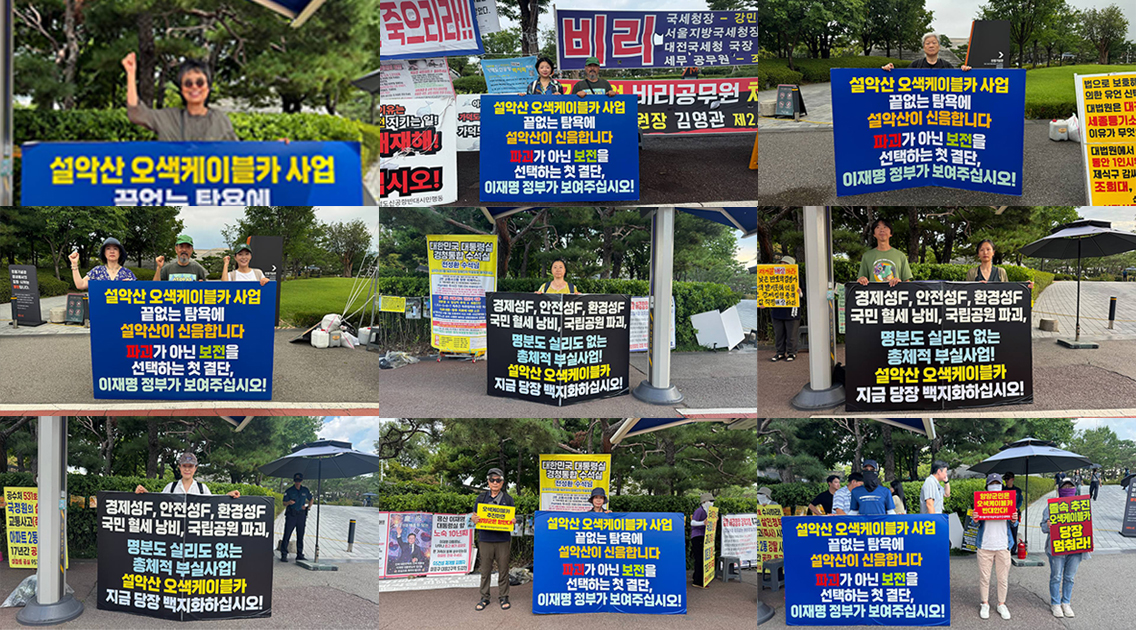 지난 8월 말, 용산 대통령실 앞은 설악산을 지키려는 간절한 목소리로 가득 찼습니다. 설악산국립공원지키기국민행동과 케이블카반대설악권주민대책위 주관으로 집중 1인 시위가 진행되었기 때문입니다.
