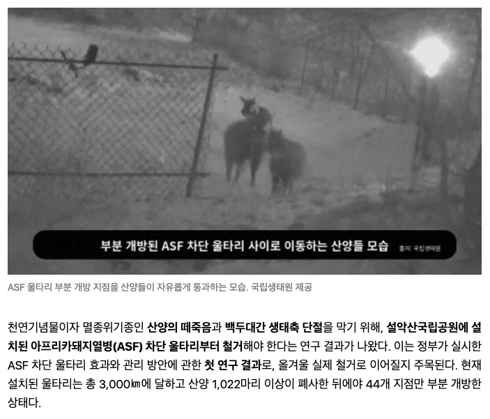 한국일보는 이기헌 더불어민주당 의원실을 통해 환경부로부터 받은 'ASF 차단 울타리 효과 분석 및 관리 개선 방안 연구'와 'ASF 차단 울타리 멸종위기야생생물 생태계 영향 조사'를 분석했다. 연구는 각각 한국환경연구원(KEI)과 국립생태원이 지난해 4월부터 1년 2개월간 수행했다. 국립생태원은 차단 울타리 내 생태계 영향을 조사한 뒤 개방 필요 구간을 제안했고, KEI는 이 자료를 포함해 차단 울타리의 ASF 확산 지연 효과와 개방 가능 구간을 도출했다.