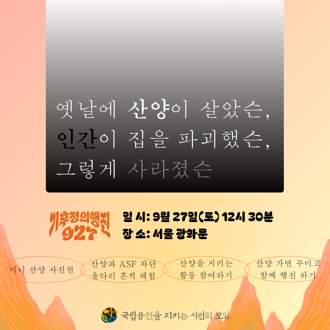 1,058마리의 마지막 겨울을 함께 돌아보고, 설악산 오색케이블카와 아프리카돼지열병(ASF) 차단 울타리가 단절시킨 생태계와 산양의 흔적을 '927 기후정의행진' 국시모 부스에서 체험해 볼 수 있어요. 산양 보전을 위한 직접행동도 해보고, 산양 가면을 꾸며서 함께 행진하는 시간도 준비했습니다.